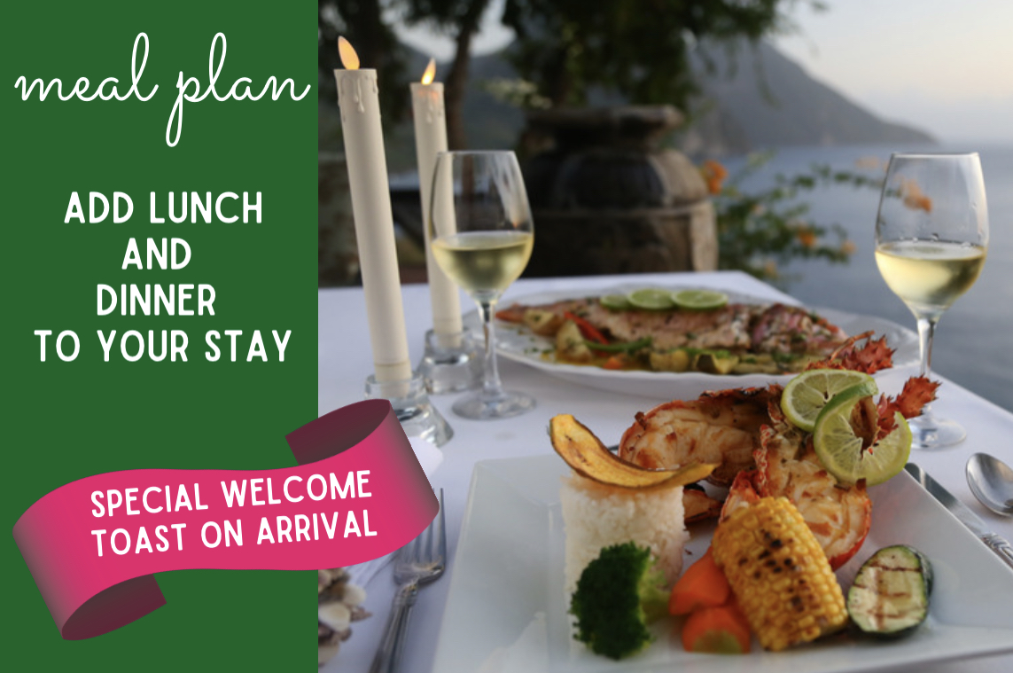The next best deal on the island – our signature buffet breakfast, lunch, and 3 course dinner includes one wine, beer, rum punch or soda with lunch and dinner plus unlimited bottled water during your stay *NOT TO MENTION* our special WELCOME TOAST on arrival of Sparkling wine – starts with lunch and dinner on your day of arrival – ends with breakfast on your day of departure. Two night minimum stay required. Must purchase for each night for the total length of your stay. Check the meal plan box when booking. $170 per person per night + tax and gratuity (when purchased with booking; if purchased after price increases – 2025 pricing)