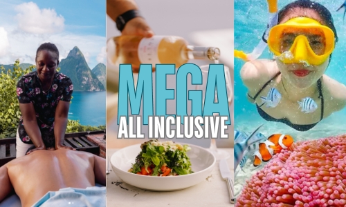 Our five nights or more “mega” all inclusive package includes: roundtrip Airport transportation in a private airconditioned vehicle; welcome sparkling wine and gift bag; all meals and individual drinks + daily snack + in room mini bar; Couples massage – 45 minute full body massage in an open air setting overlooking the Pitons and Caribbean; Mud bath excursion (roundtrip transport plus entry fee) – Experience the worlds only drive through volcano and it’s healing mud bath; Snorkeling excursion – 2.5 hour speedboat excursion with stops at Sugar Beach and Anse Chastnet breath-taking snorkeling; and visit to bat cave includes gear, water, fruit; Chocolate making lesson; Our rum tasting experience: Experience seven of St. Lucia’s finest rums during our one hour rum tasting session. Learn how rum is made and the best way for it to be enjoyed. Take home a souvenir shot glass.