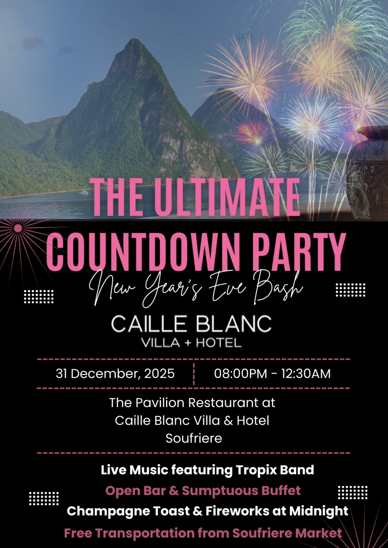Join our New Years Eve Event. Buffet, open bar, fireworks view, Tropix Band playing the best tunes to help you dance into the new year. Midnight countdown with champagne toast and noise makers. Book now $200US per person pricing + tax + gratuity. Reservations Required. Click here to book!