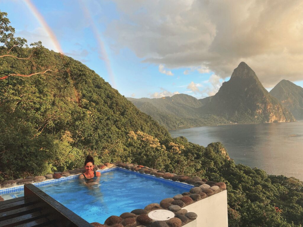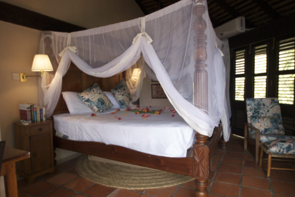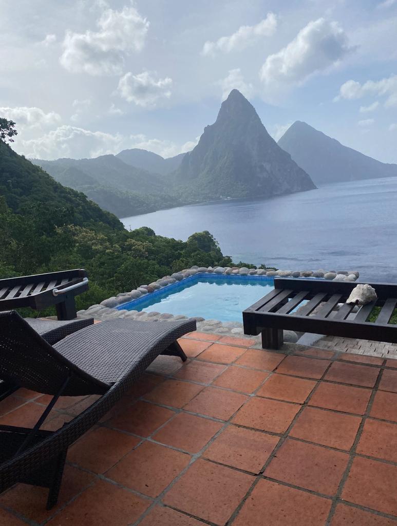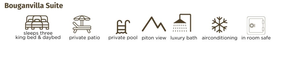 The Bouganvilla Suite has a private dunking pool overlooking the Pitons and is appointed with a four-poster, king size bed as well as a four-poster day bed. The air conditioned Bouganvilla Suite connects to the Living Room/Entertainment Center. The granite bathroom has a large shower and bath with an open picture window view of the Pitons. The terracotta patio outside the bedroom’s plantation doors is very secluded for your private moments in the dunking pool viewing the majestic Pitons.